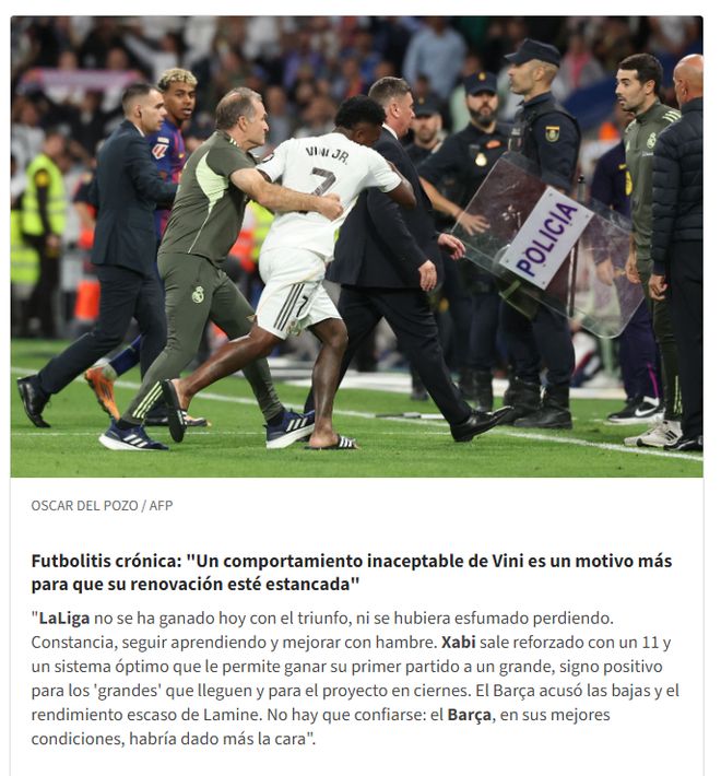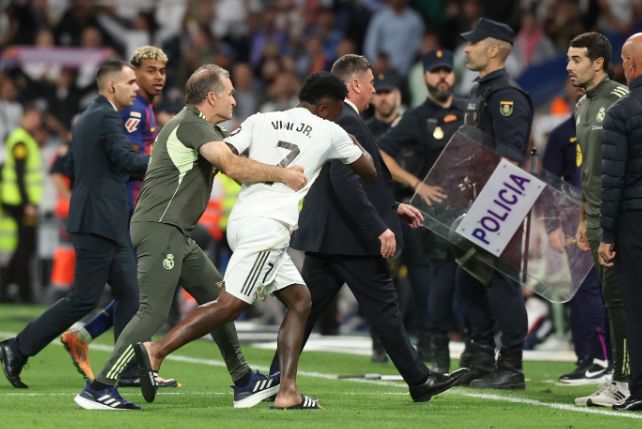 在门将教练的劝解下,维尼修斯才回到了替补席。当双方球员在最后时刻两次发生冲突时,维尼修斯都冲在了最前面,阿隆索甚至亲自把维尼修斯拉回更衣室。比赛结束之后,维尼修斯再次冲向亚马尔,被五名助教死死拉住。