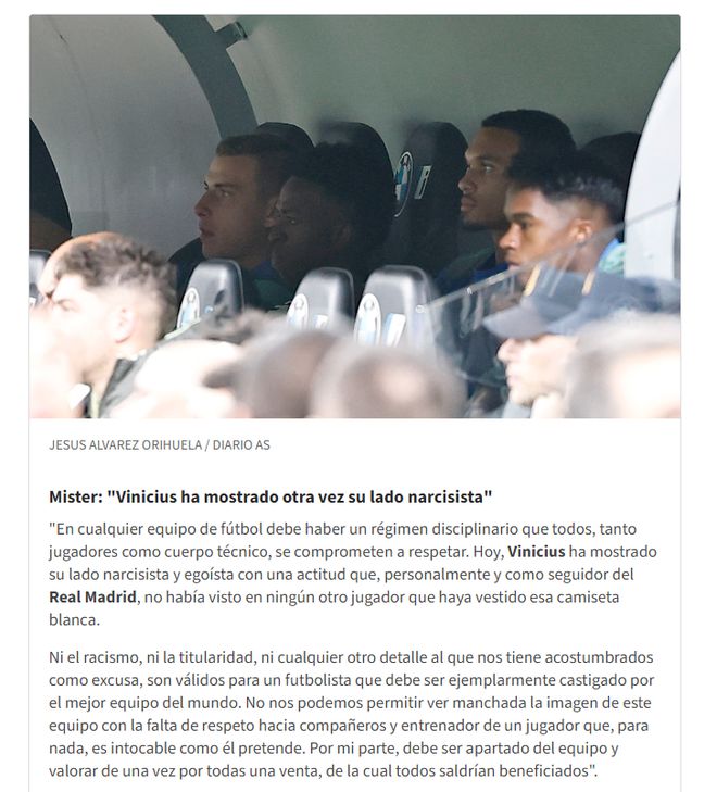 “任何球队都有自己的纪律,球员、教练甚至工作人员都应该遵守这些纪律。维尼修斯展示了他自恋、自私的一面,我之前从未在任何皇马球员身上见到过这样的态度。”