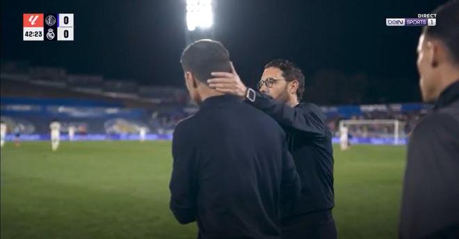 赫塔菲主帅博达拉斯立刻严厉制止自己教练组成员,要求所有人坐在位置上,随后亲自走向阿隆索。两位主帅在边线附近展开对话。